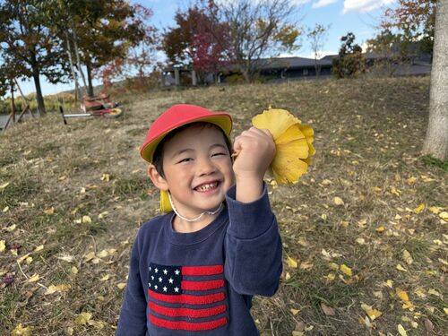 園庭の木々が赤や黄色に色づきとっても綺麗です よちよちぐみ(1歳児)のお友だちが「あ・か!」「きーろ!」と落ち葉を拾って覚えたばかりの色の名前をつぶやく姿がたまらなくかわいい今日この頃… 最近は、綺麗に色付いた落ち葉を拾って集め、花束に見立てる…