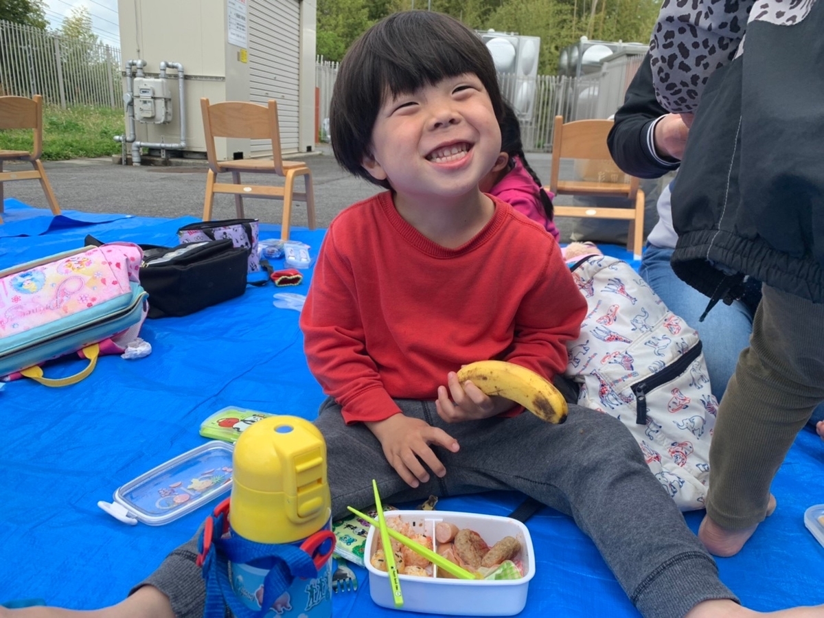 今回は雨で地面がぬかるんでいた為、どのクラスも園舎裏でいただきました。